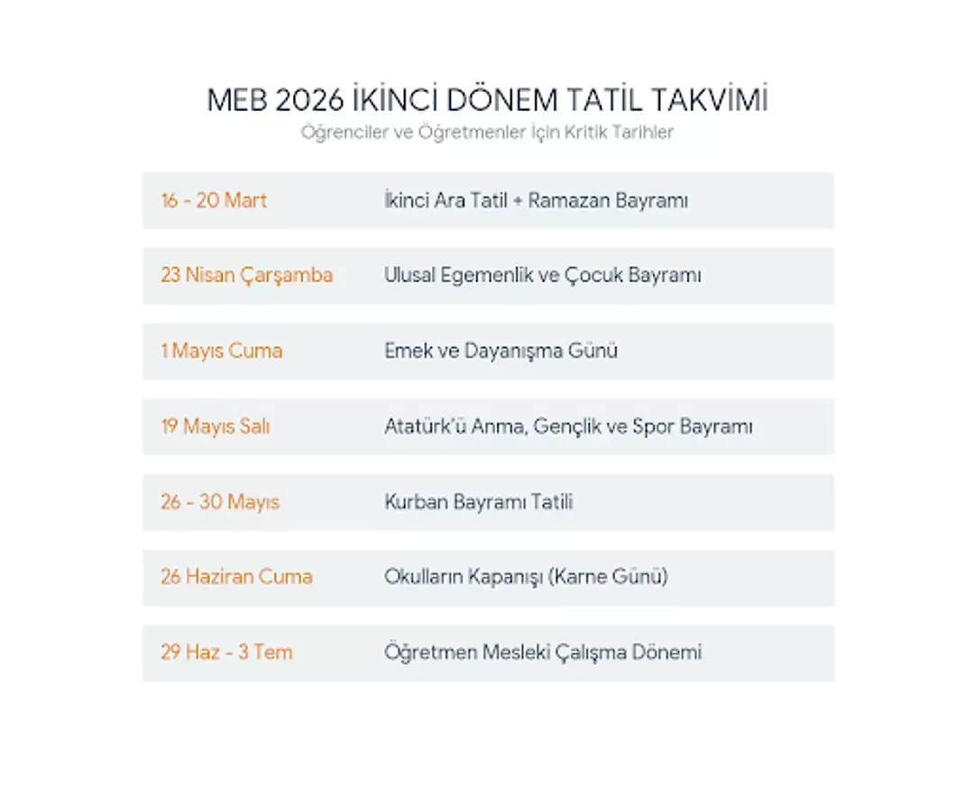 Milli Eğitim Bakanlığı (MEB), 2025-2026 eğitim öğretim yılı ikinci dönem çalışma takvimini yayımladı. Açıklanan takvimle birlikte öğrencilerin ve velilerin yakından takip ettiği ara tatil, bayram tatili ve yaz tatili tarihleri netleşti.