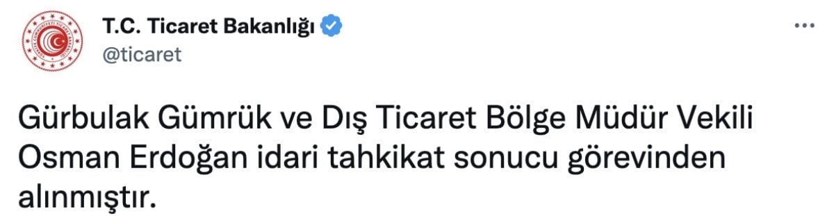 Açıklamada, “Gürbulak Gümrük ve Dış Ticaret Bölge Müdür Vekili Osman Erdoğan idari tahkikat sonucu görevinden alınmıştır.” ifadesi kullanıldı.