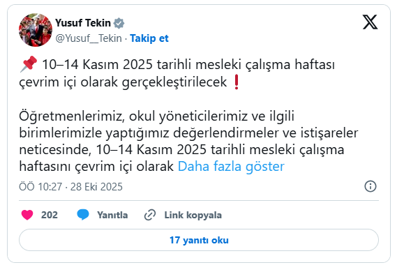 “Öğretmenlerimiz, okul yöneticilerimiz ve ilgili birimlerimizle yaptığımız değerlendirmeler sonucunda, 10-14 Kasım 2025 tarihli mesleki çalışma haftasını çevrim içi olarak gerçekleştireceğiz. Eğitim ailemize hayırlı, uğurlu olsun.”