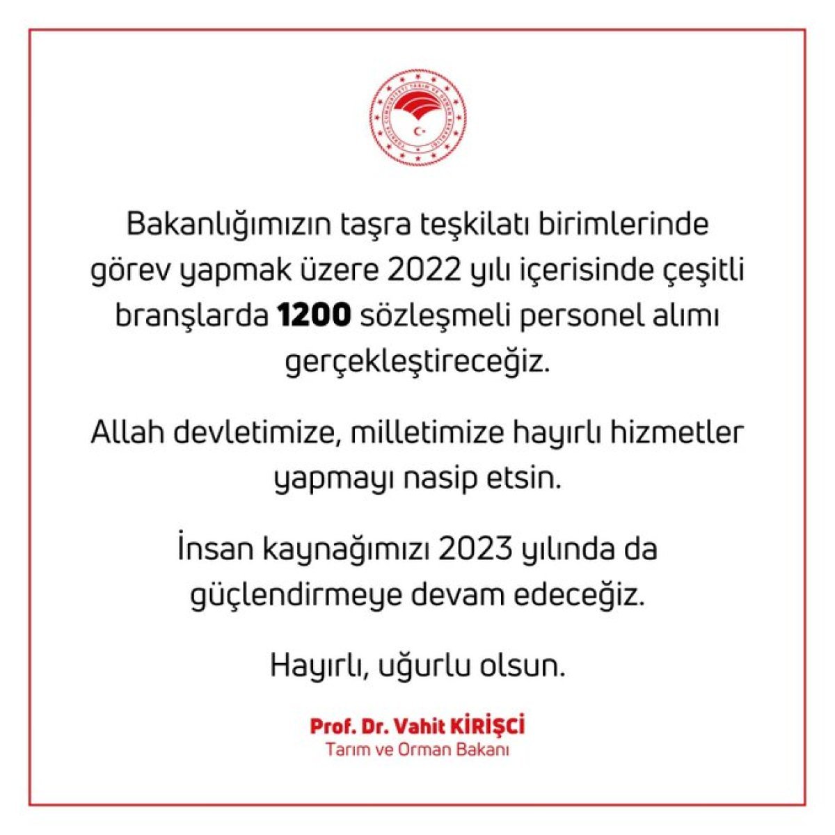 Tarım ve Orman Bakanı Vahit Kirişçi sosyal medya hesabından bir müjdeyi duyurdu. Bakan 2022 yılı içerisinde 1200 sözleşmeli personel alımı yapılacağını açıkladı.