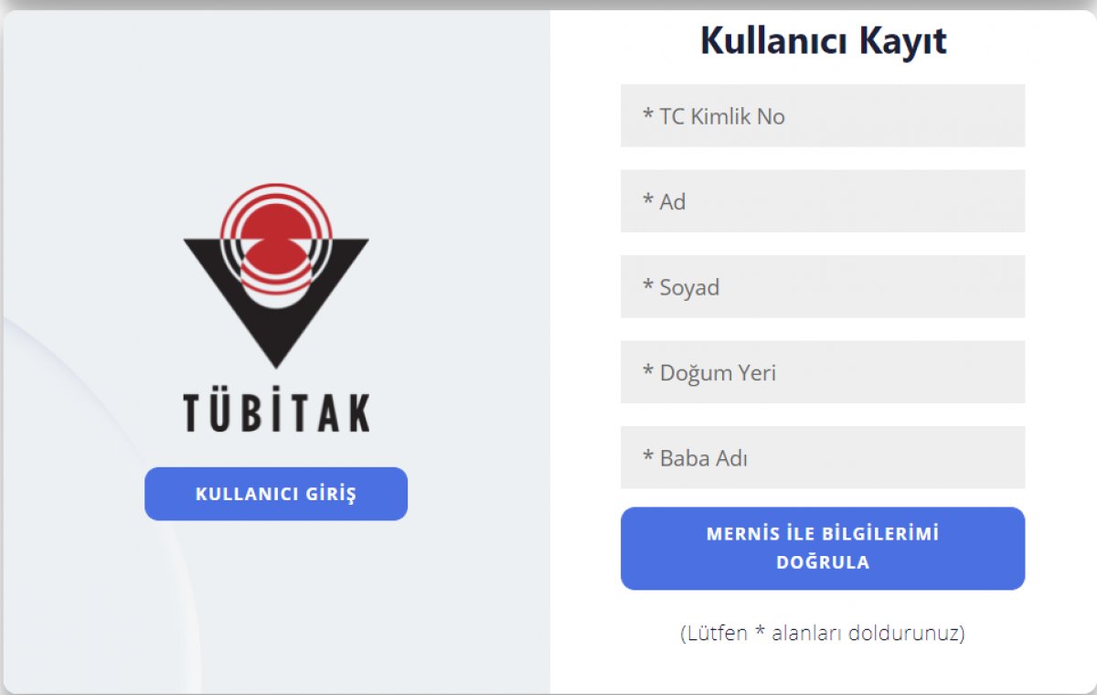 1- Öncelikle, aşağıdaki bağlantıdan TÜBİTAK kayıt sayfasına gidip kullanıcı kaydı oluşturmanız gerekiyor.