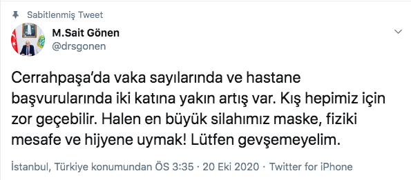 ”Cerrahpaşa’da vaka sayılarında ve hastane başvurularında iki katına yakın artış var. Kış hepimiz için zor geçebilir. Halen en büyük silahımız maske, fiziki mesafe ve hijyene uymak! Lütfen gevşemeyelim.’