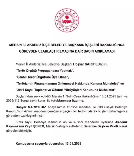 İçişleri Bakanlığı, Akdeniz Belediyesi’ne kayyum atandığını açıkladı.