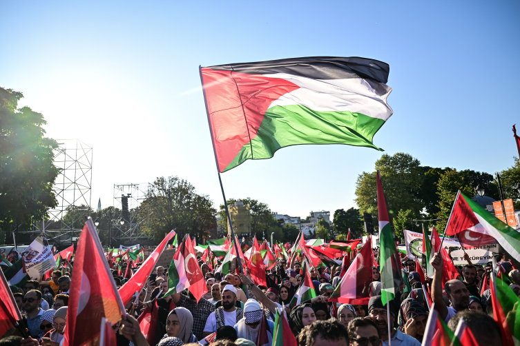 Vatandaşlar Türk ve Filistin bayrakları ile Kelime-i Tevhid flaması ve kefiye taşıdı, Filistin’in özgürlüğü için sloganlar attı.
