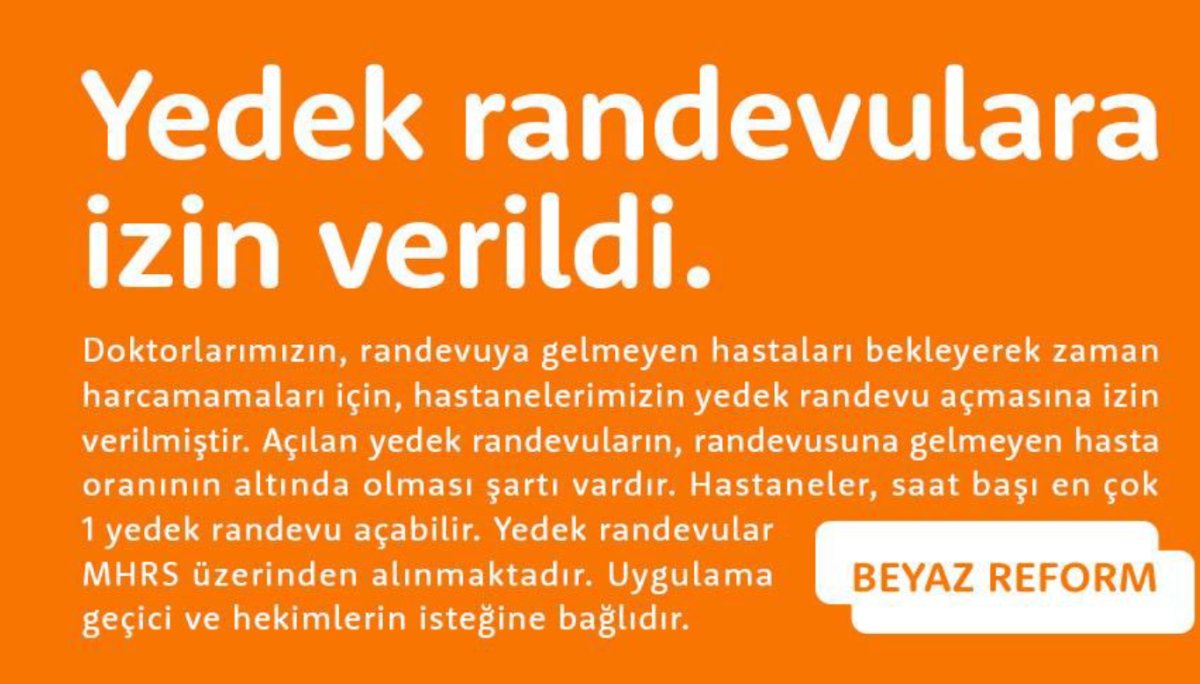 “Açılan yedek randevuların, randevusuna gelmeyen hasta oranının altında olması şartı vardır. Hastaneler, saat başı en çok 1 yedek randevu açabilir. Yedek randevular MHRS üzerinden alınmaktadır. Uygulama geçici ve hekimlerin isteğine bağlıdır.”