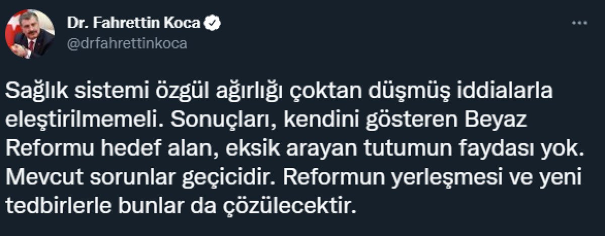 Fahrettin Koca, mevcut sorunların reformun yerleşmesi ve yeni tedbirlerle çözüleceğini vurgulayıp, “Sağlık sistemi özgül ağırlığı çoktan düşmüş iddialarla eleştirilmemeli.” ifadelerini kullandı.