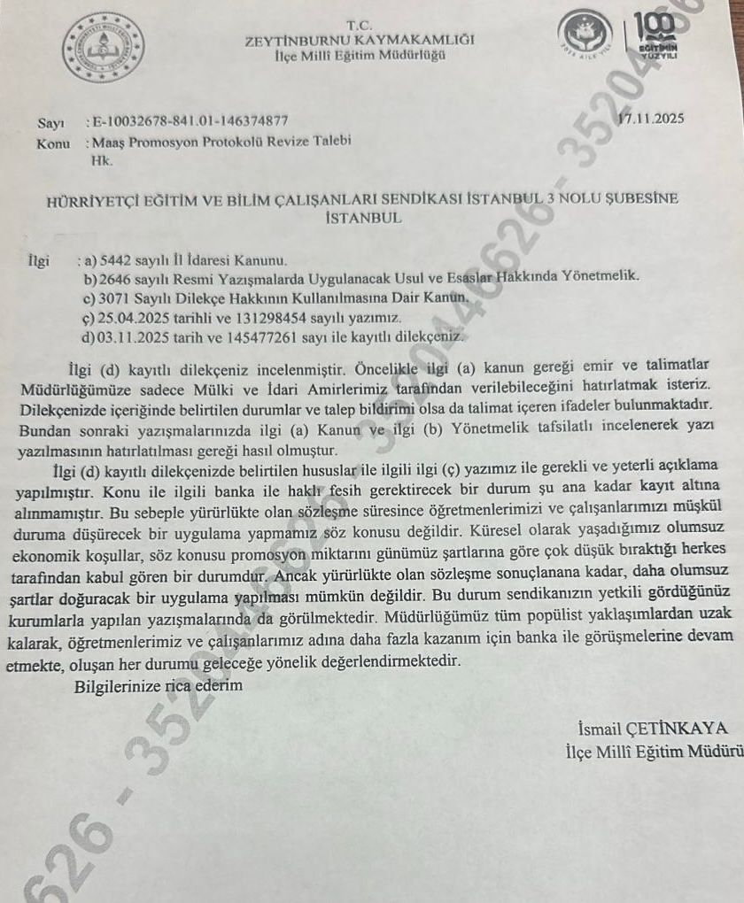 İstanbul Zeytinburnu İlçe Millî Eğitim Müdürlüğünün sendikamıza göndermiş olduğu cevabi yazı; hukuki açıdan tutarsız, ifadeleri birbiriyle çelişen, sendikal hakları yok sayan ve tarafsızlık ilkesine aykırı bir içerik taşımaktadır. Bu nedenle kamuoyunu bilgilendirme zorunluluğu doğmuştur.