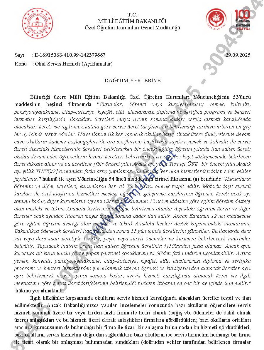 29 Eylül 2025 tarihli ve 142379667 sayılı yazıyla iletilen bilgilendirmede, özel okulların servis hizmeti ücretlerini mevzuat hükümlerine uygun biçimde tespit edip ilan etmeleri gerektiği vurgulandı.