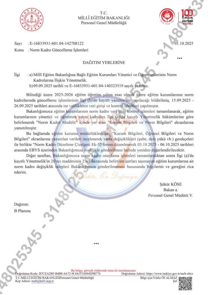 Resmi yazıya göre, okul müdürlükleri norm kadro verilerini e-Kayıt sistemi üzerinden kontrol edecek ve gerekli güncellemeleri yapacak.