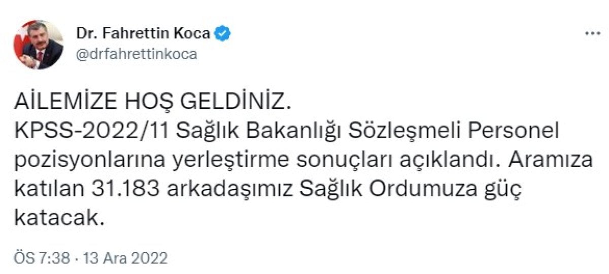 “KPSS-2022/11 Sağlık Bakanlığı Sözleşmeli Personel pozisyonlarına yerleştirme sonuçları açıklandı. Aramıza katılan 31.183 arkadaşımız Sağlık Ordumuza güç katacak.”